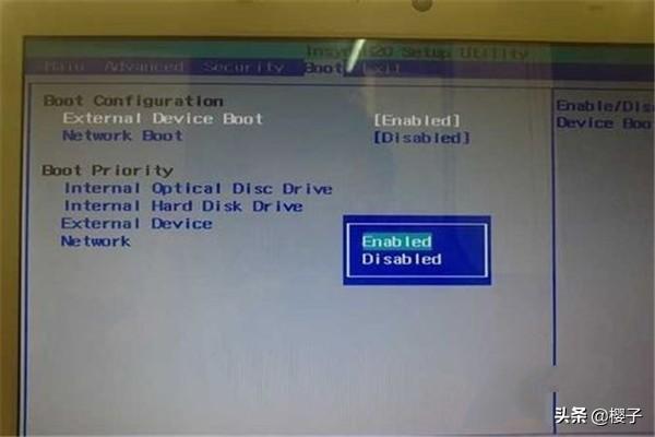 用制作好的U盘启动盘插入电脑中,开机,当出现电脑屏幕画面时按F2进去BIOS,用键盘左右键找到Boot,再点击Enter就找到External Device Boot
