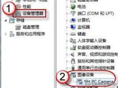 2、在“电脑管理”窗口左边一栏,双击“设备管理器”。然后,从右边栏中找到“图像设备”,点开。在摄像头设备上右键鼠标,选择“属性”。