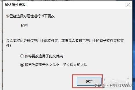 4、弹出”确认属性更改“的窗口,选择”将更改应用于此文件夹,子文件夹和文件“,然后点击”确定“。
