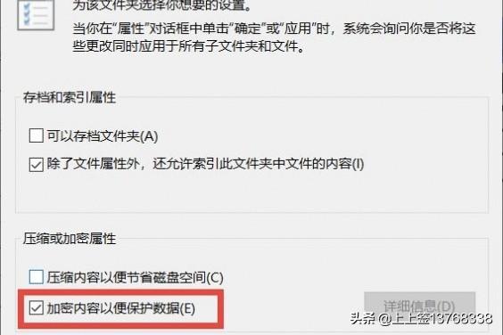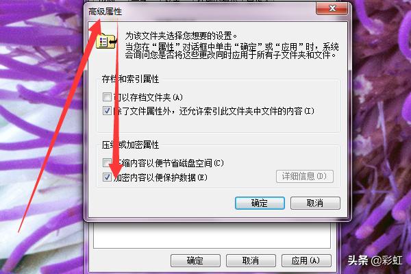 右键单击文件夹,选择属性,在属性窗口内点击高级,勾选加密内容以便保护数据,点击确定,最后在属性窗口内点击应用。