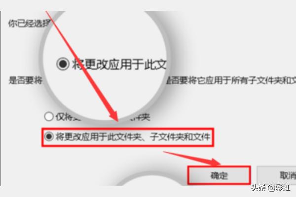 接着,在弹出的确认属性更改窗口中,选择“将更改应用于此文件夹、子文件夹和文件”,然后点击“确定”按钮。