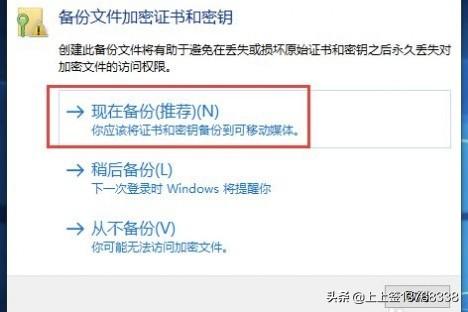 系统会弹出备份文件加密证书,选择“现在备份”。