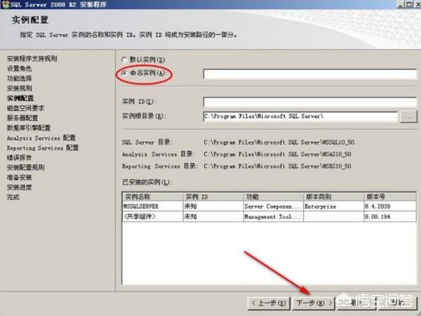 10、实例配置中选中“命名实例”,输入实例名(这里需要注意的是,如果服务器上已经安装有SQL2000,请不要使用SQL2000的实例名进行升级处理),点击“下一步”。