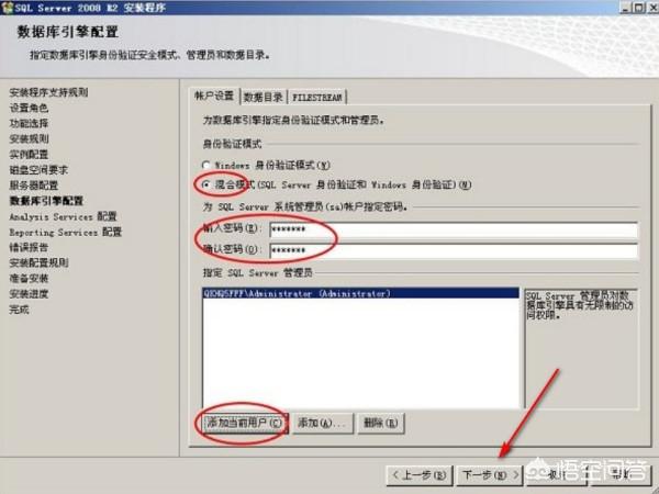 13、 数据库引擎配置中为数据库引擎指定身份验证模式和管理,如红圈所示,选择混合模式,输入密码,SQL2008对sa的密码强度要求相对比较高,需要有大小写字母、数字及符号组成,否则将不允许继续安装。