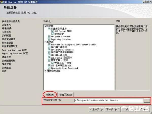 8、单击“全选”按钮选择全部组件,上图红框处更改安装目录到空闲较多的逻辑盘下,如果系统盘比较空闲,可以使用默认值,推荐更改安装,点击“下一步”。