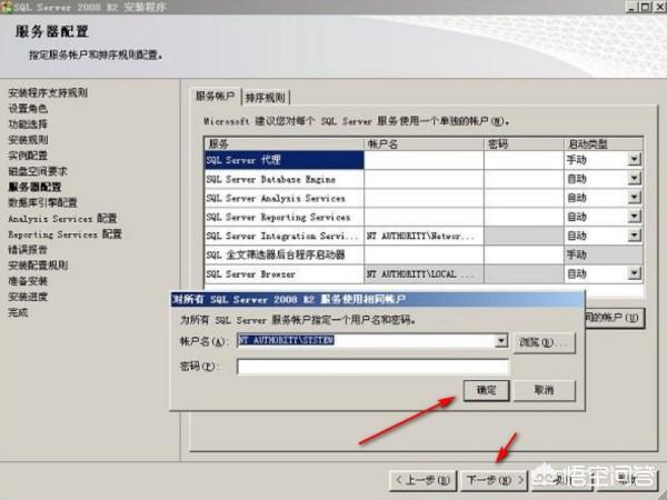 12、服务器配置,服务器配置主要是服务启动帐户的配置,可以通过单击“对所有SQL Server服务使用相同账户”按钮,统一指定SQL Server的指定账户,服务的账户名推荐使用NTAUTHORITY\SYSTEM的系统账户,单击“确定”后点击“下一步”。