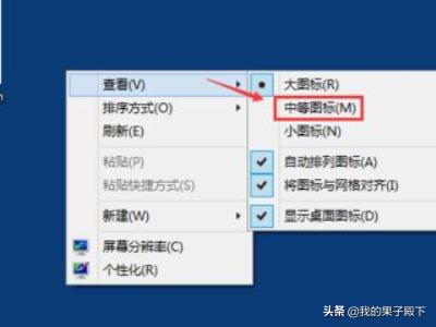 1、右键单击Win10系统桌面上的空白,将鼠标移到视图顶部,选择中号图标,选择之后,桌面图标将变得更加适中。