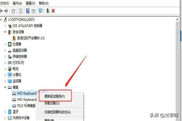 4.右键点击键盘选择【更新驱动程序软件】,更新一下驱动软件,然后重启一次键盘看一下能否正常使用。