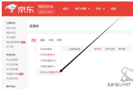 3、来到优惠券界面后,我们将鼠标放置在“可用优惠券”上,在弹出的下拉框中选择“回收站优惠券”选项。