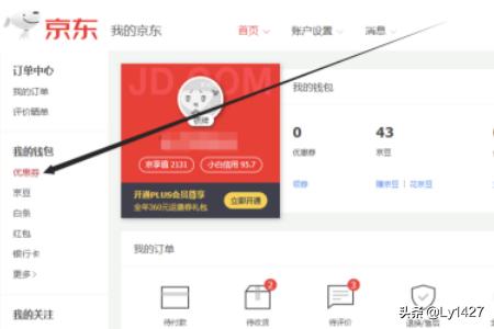 2、在我的京东界面中,我们点击左侧的“优惠券”选项卡,切换至优惠券界面。