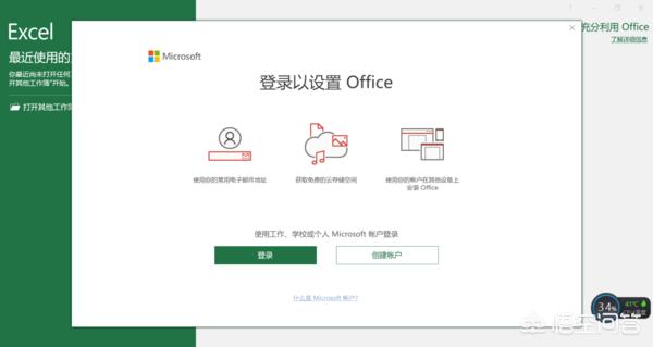 4、先确认操作系统已经激活,然后点击开始菜单并打开任意一款Office软件,例如Excel 2016,打开后会弹出“登录以设置Office”,如果已经注册了微软账户,需点击“登录”;如果尚未注册微软账户,需点击“创建账户”并按照提示注册一个微软账户。
