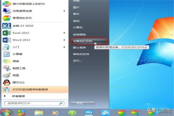 7.添加完凭证后,让我们回到“设备和打印机”管理界面去看一下刚才添加好凭证的打印机状态。点击“开始”-“设备和打印机”按钮