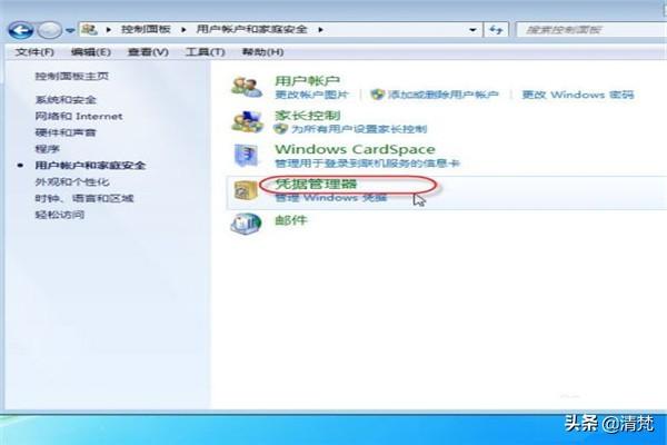3.弹出“用户账户和家庭安全”窗口,点击“凭证管理器”链接