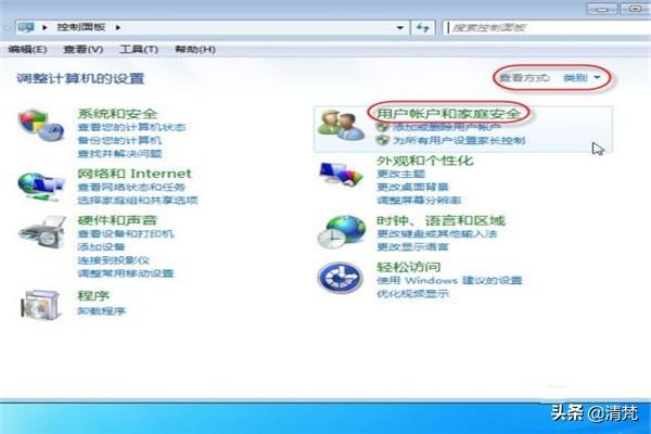 2.弹出“控制面板”窗口,查看方式切换到:类别,点击“用户账户和家庭安全”链接