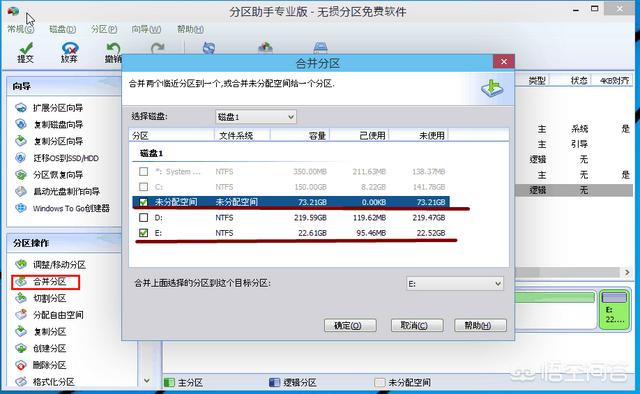 4、如果你还想对这个未分配空间进行利用,我们可以看到E盘空间很小只有大概22GB,这个时候我们就可以把这部分“未分配空间”合并到E盘。首先选中E盘,点击左边任务栏的“合并分区”。