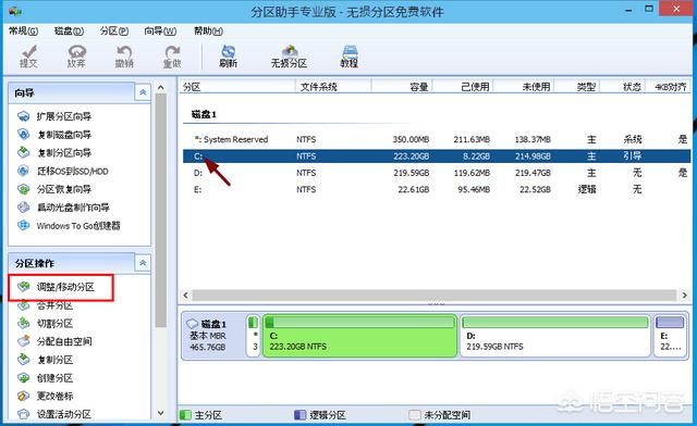 1、下载免费的win10系统分区工具分区助手,安装并运行。如下主界面,C盘此时的容量显示为大约223GB。选中我们的C盘之后;点击“调整/移动分区”选项。
