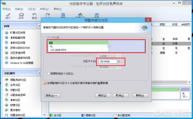 2、来到此对话框,此时我们可以调整分区大小。然后当鼠标指针变成双向箭头时,拖动直到你满意的容量位置。这里C盘已经被操作为150GB。之后点击“确定”。