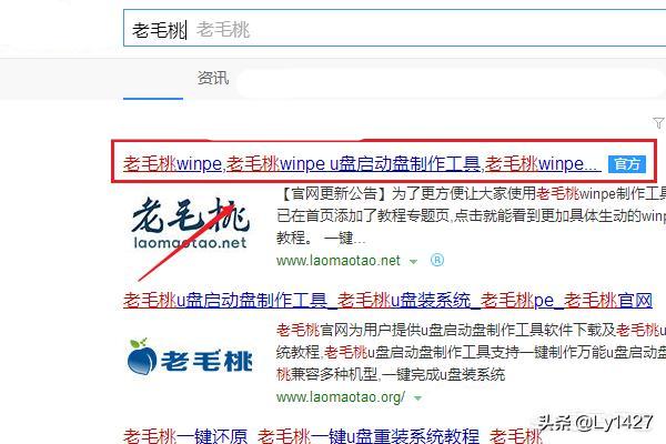 1、点击搜索结果词条,进入老毛桃官网。