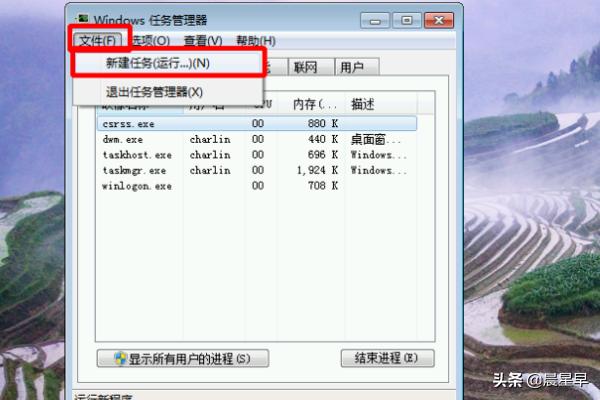 3、在任务管理器中选择“文件”,然后选择“新建任务(运行)”。